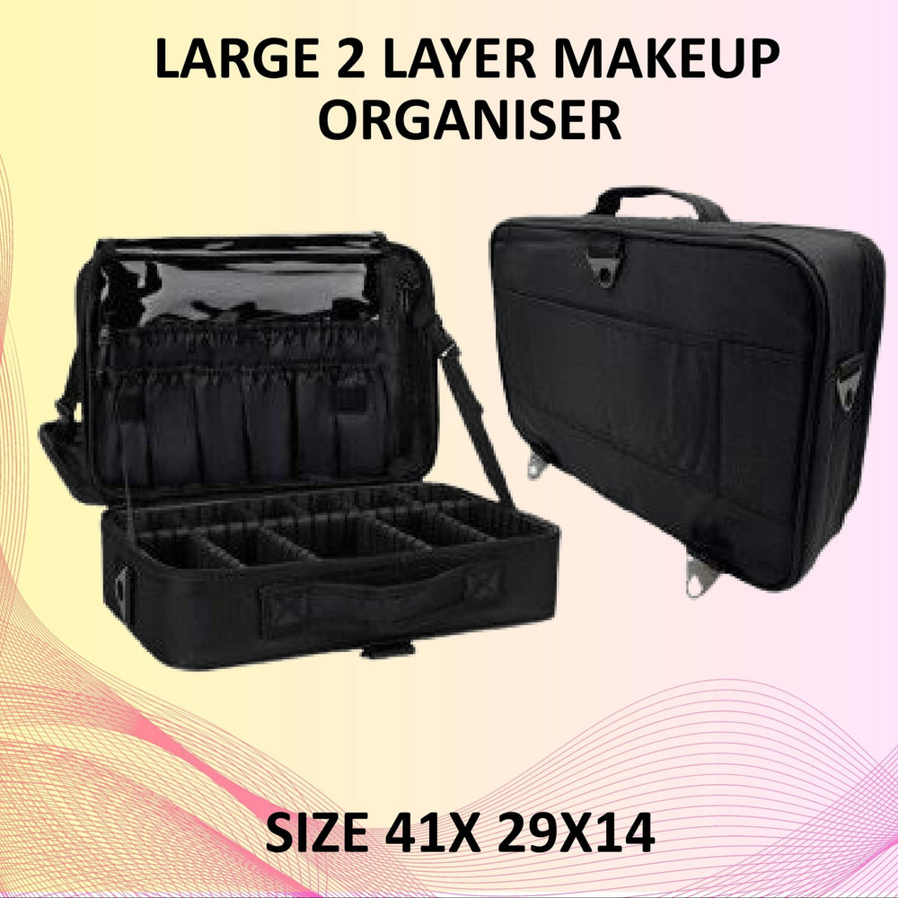 This large 2-layer makeup organizer is perfect for makeup artists and beauty lovers who want clean, customizable storage. With adjustable dividers, brush slots, and zippered compartments, it fits all your makeup, skincare, and tools – whether at home or on the go. The 41x29x14 cm size makes it spacious yet compact enough to travel with ease.